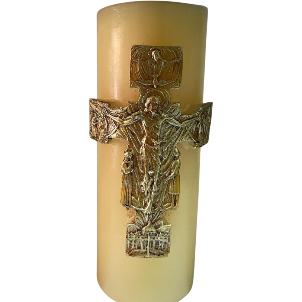 Cirio Cruz Santisima Trinidad, moldeada con una representación de las tres personas de Dios. Esta vela tipo Cirio es Ideal para honrar momentos de fe y reflexión en un entorno significativo.