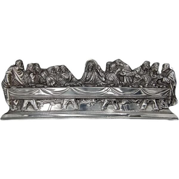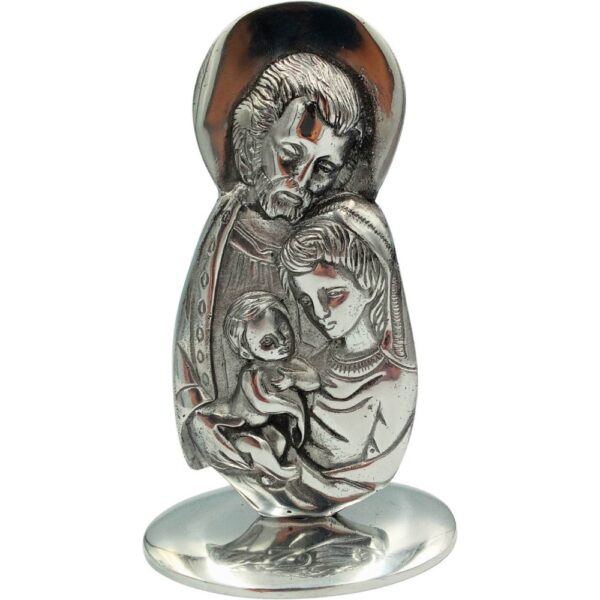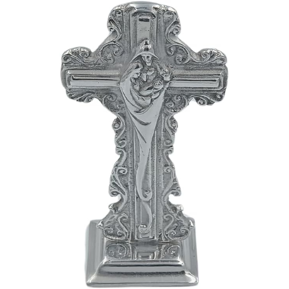 Cruz de Pewter con la Sagrada Familia y Base. Su diseño devoto y acabado rústico la convierten en una pieza decorativa significativa y espiritual para cualquier hogar.