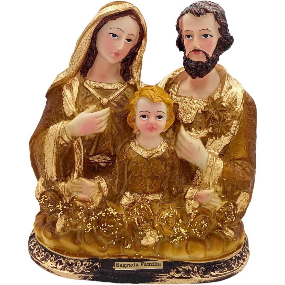 Sagrada Familia en resina con acabado en tonos dorado y café cálido. Escultura religiosa de 19 cm de altura. Imagen decorativa para altar, hogar o capilla. Símbolo de fe, amor y protección