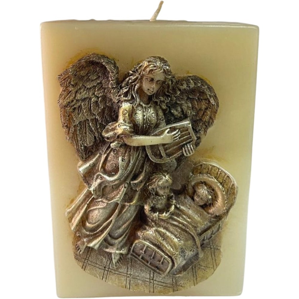 Vela rectangular de cera de abeja aroma vainilla, moldeada con la imagen de un ángel de la guarda. Excelente para añadir un toque espiritual y de vigilancia a tus momentos de oración.