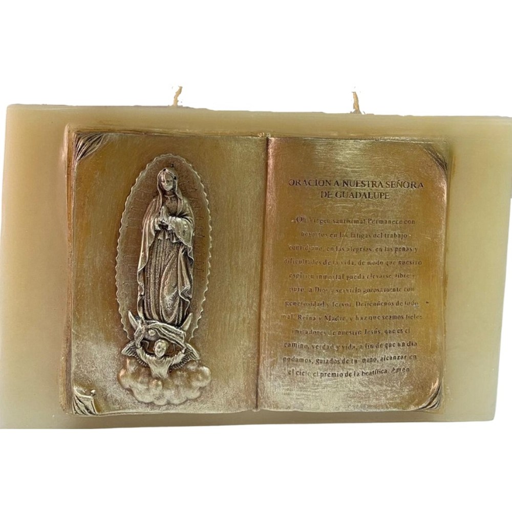 Vela rectangular de cera de abeja aroma vainilla, moldeada con una oración a la Virgen de Guadalupe. Perfecta para enriquecer tus momentos de oración y espiritualidad.